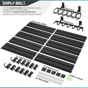 Unlike generic slat walls, this dedicated Wall Rack System uses proprietary steel slat wall panels and purpose-built attachments engineered exclusively for this setup — ensuring a secure, seamless fit and maximum load capacity. The kit includes ten heavy-duty powder-coated panels, a vertical rifle rack attachment, and 12 height-adjustable swivel-lock brackets that can be arranged to hold everything from .50 cal long guns to subcompact pistols.